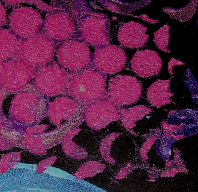 closeup of the molding paste mixed with paint and applied through a piece of Punchinella (plastic ribbon that is left over after sequins are punched out) - also referred to as "sequin waste" . . .